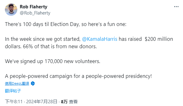 哈里斯竞选团队副经理罗布·弗莱厄蒂(Rob Flaherty)当地时间7月28日表示,在哈里斯接棒拜登竞选美国总统的首周,该团队就已经募集了2亿美元,其中66%来自首次捐赠者。